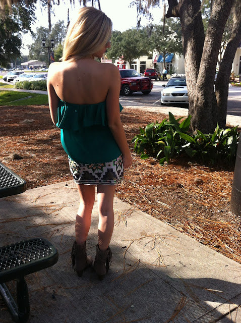Hey Ladies! I just love this multi-colored sequin aztec printed skirt! With this chilly weather we've had these past few days I decided to add this gorgeous black leather jacket with fur around the collar and these amazing taupe fringe booties to help keep warm. I love the versatility of a sequin skirt, you can dress it up for a night on the town or wear it for a day of errands.